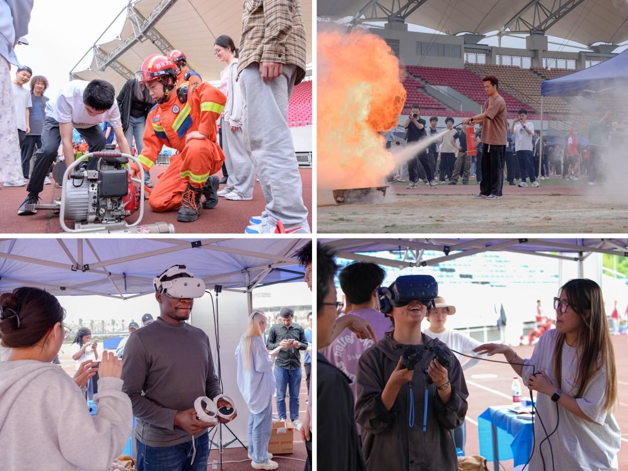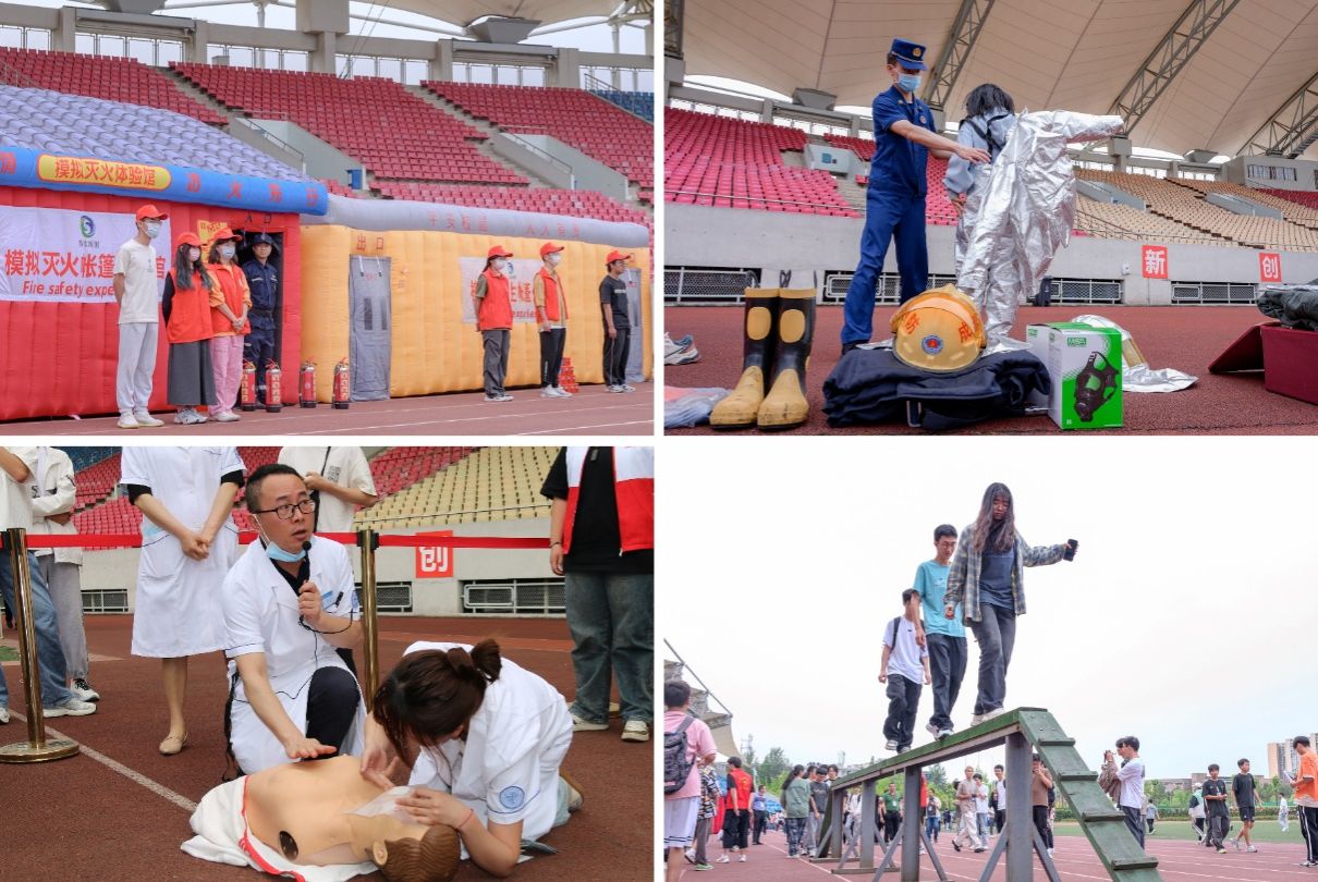 来自郫都区消防救援大队的消防救援人员展示了各类消防救援器材的正确使用方法;学校保卫处设置了灭火体验区,在现场点燃数个火盆模拟火灾现场,同学们在工作人员的指引下,成功使用干粉灭火器将火扑灭;校医院的医生们详细讲解了心肺复苏、AED(自动体外除颤器)的操作流程,并使用人体模型进行示范演示。在医生的指导下,同学们在现场进行了实践操作,亲身体验急救过程,将理论付诸实践,力求让每个动作做到准确、规范、到位。